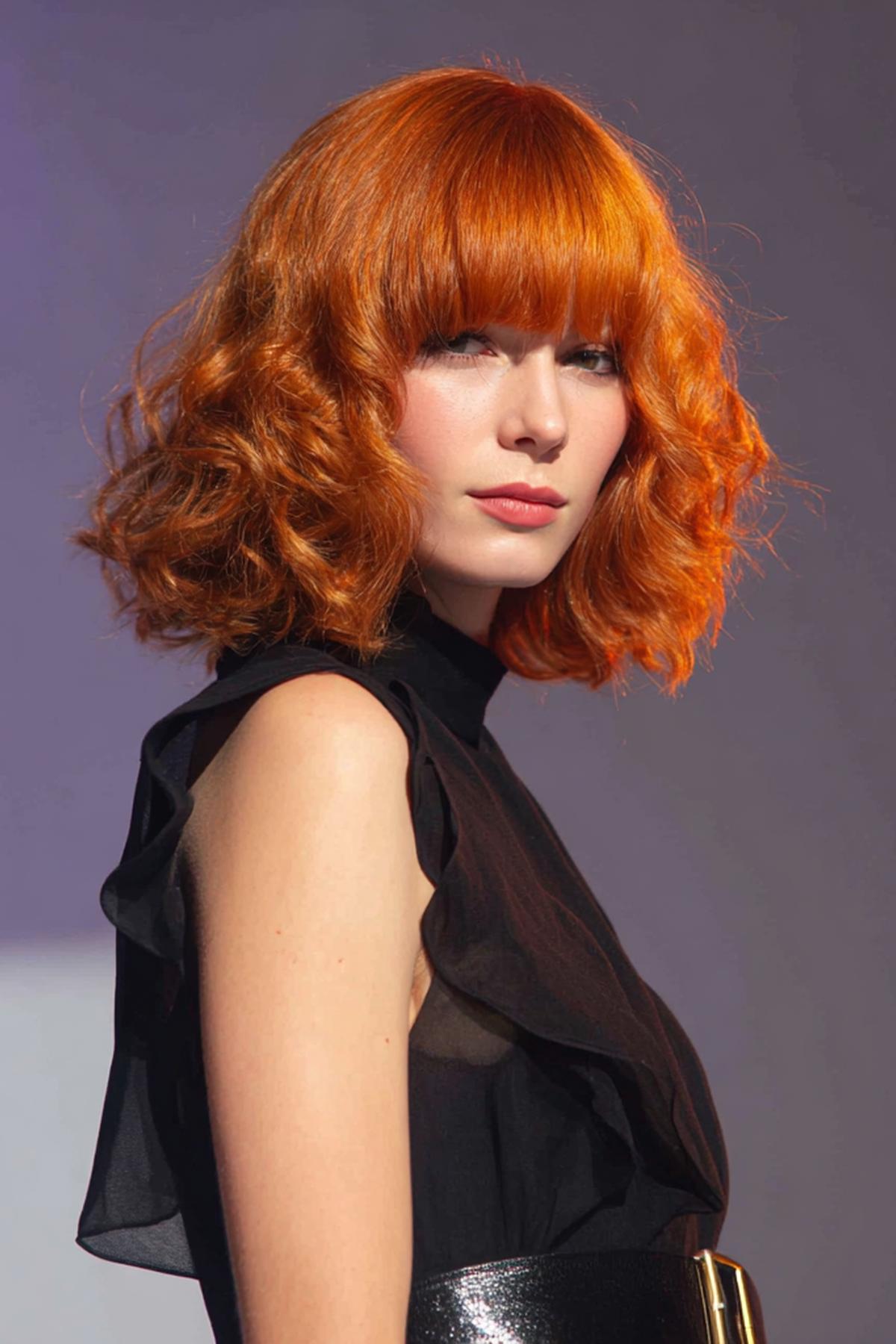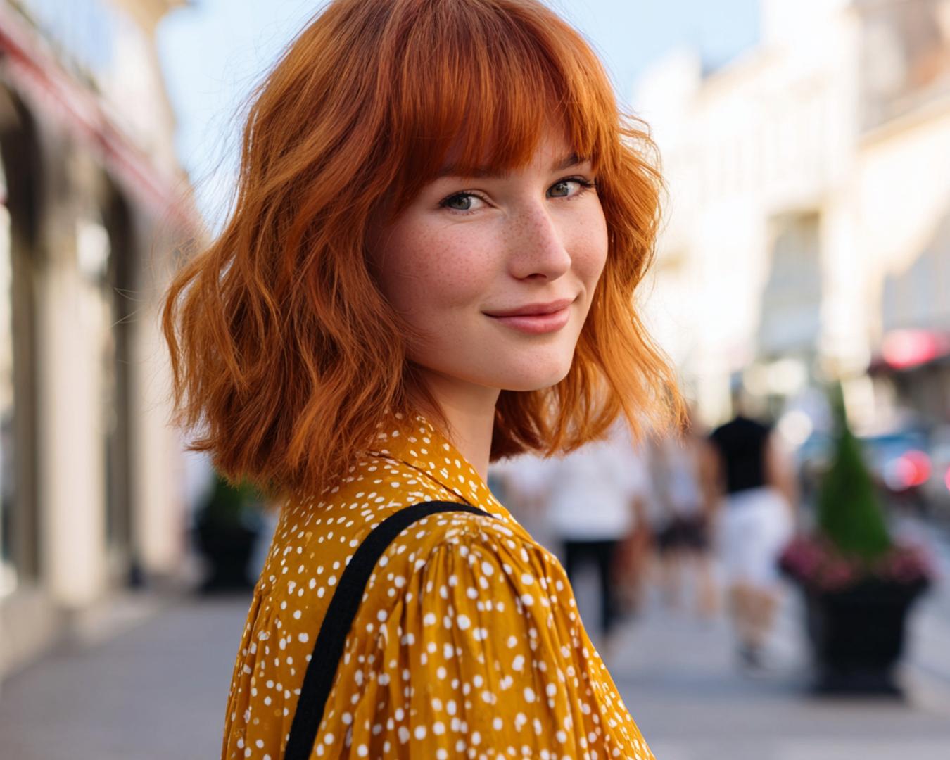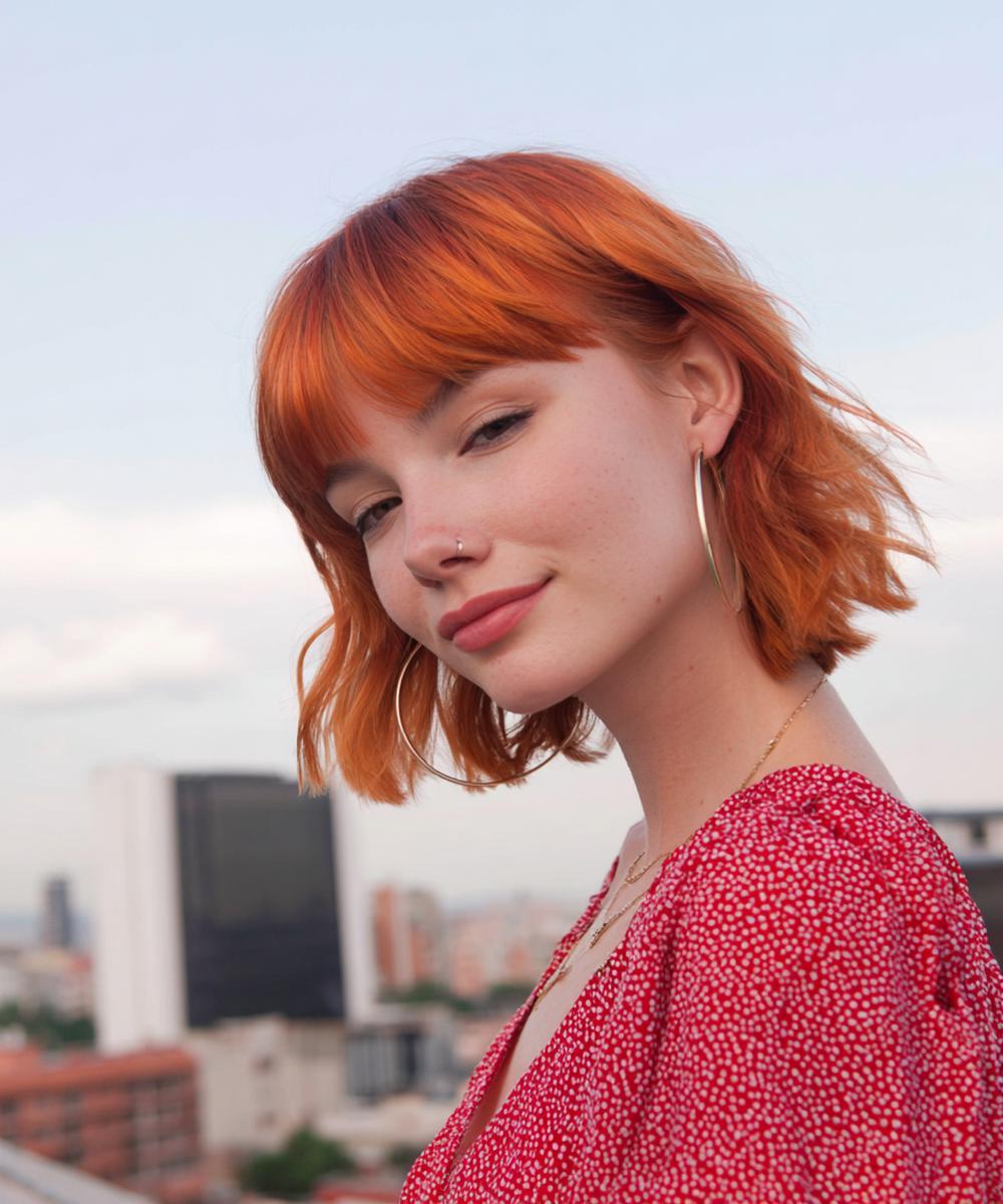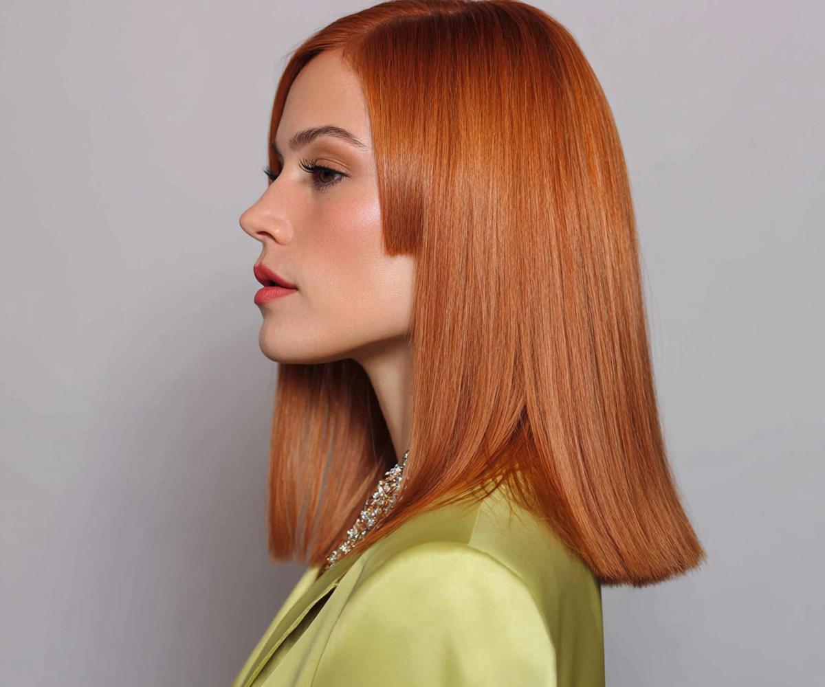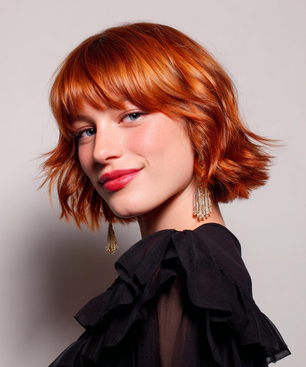 Kısa bob ve düz kahkül, cesur ama sofistike bir kombin. Küçük alınlarda kahkülü hafif kavisli kesmek iyi durur; düz-saç dokusunda mat bitiş tercih edin. Canlı bakır turuncuya yakınsa kaş tonunu yumuşatmak doğal görünümü korur.