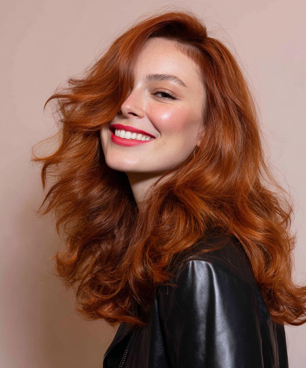 Hacimli, uzun bakır dalgalar güçlü ama zarif görünür. Yan ayrım yüzü yumuşatır; kalp ve kare yüzlerde denge sağlar. Soğuk alt tonlarda ısınma etkisi verir. Büyük fırçayla fön çekip geniş maşa ile bitir; bitiriş için hafif serum yeter.