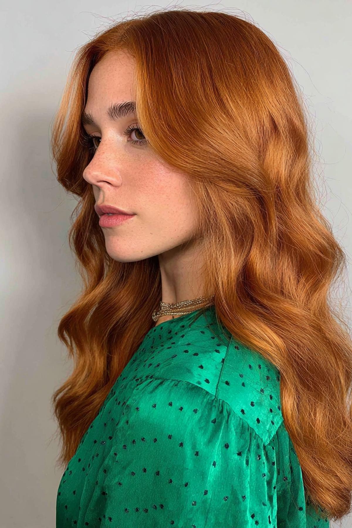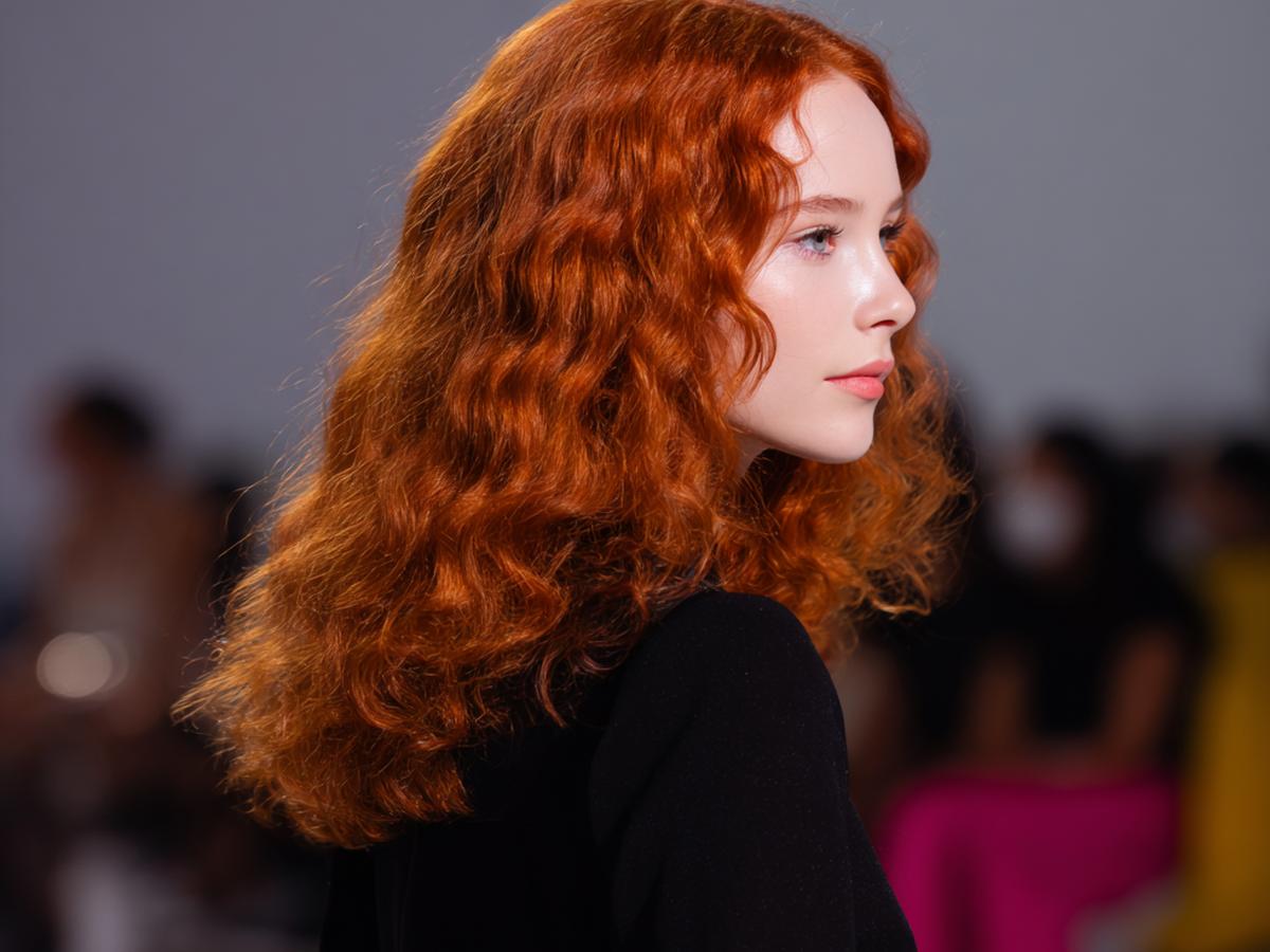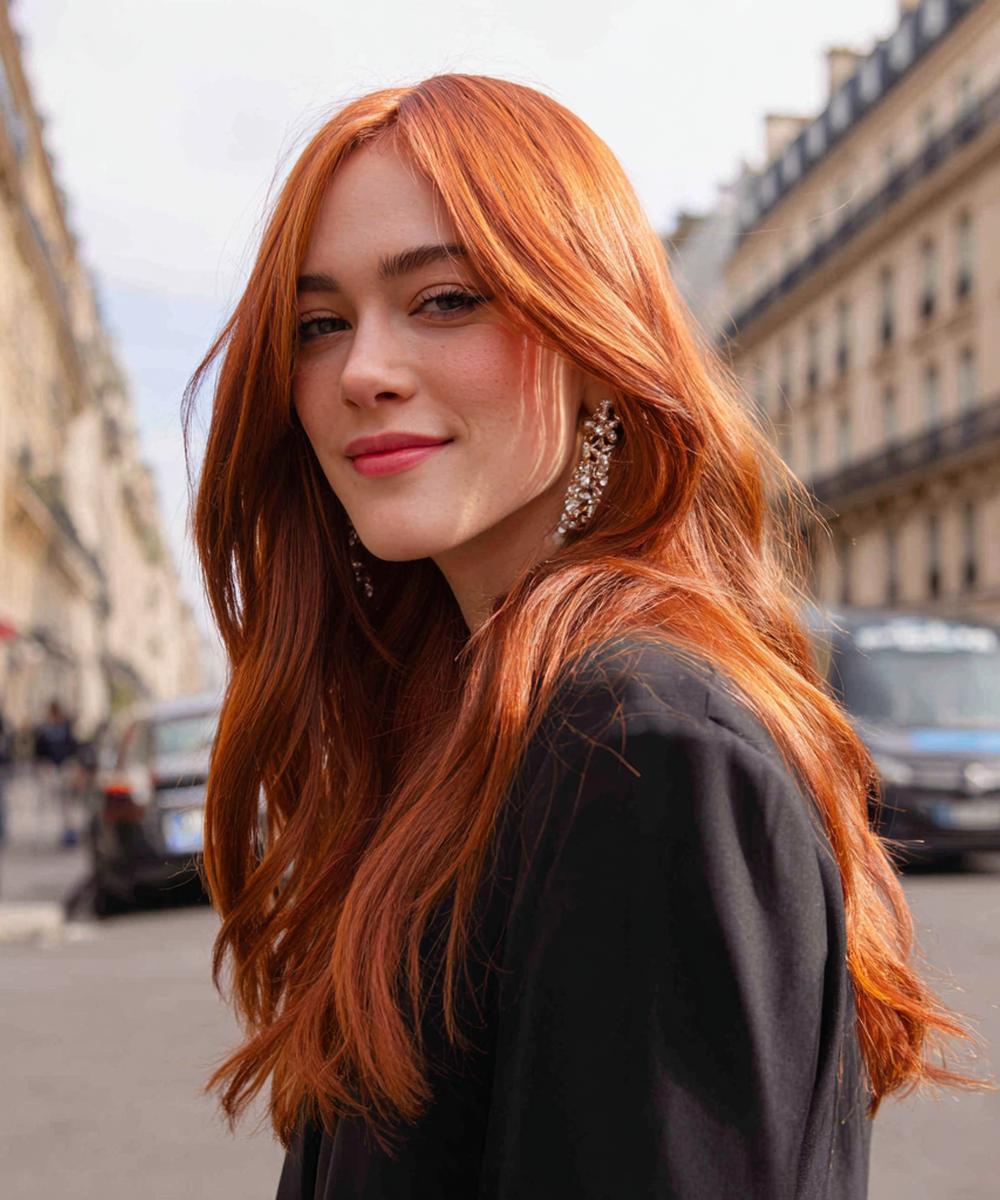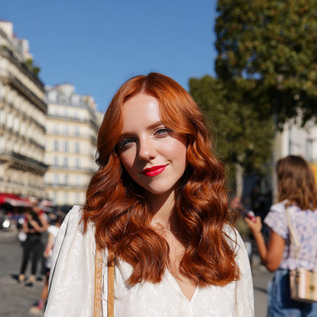 Uzun, gevşek dalgalı bakır saç; doğal kıvrımlarıyla şehir temposuna uyumlu. Omuz altına inen uzunluk, yüzü çerçeveleyip elmacık kemiklerini yumuşatır. Açık–orta tenlerde ve sıcak alt tonlarda canlı durur. Deniz tuzu spreyiyle sıkmadan şekillendir; uçlara besleyici yağ sür, renk daha derin görünür.