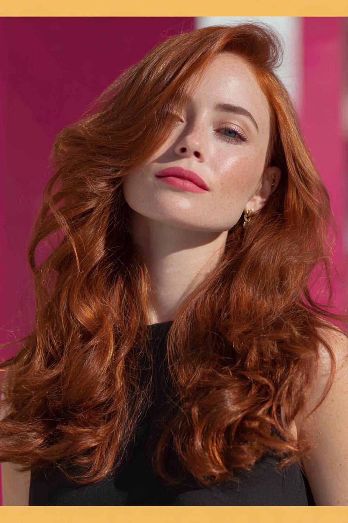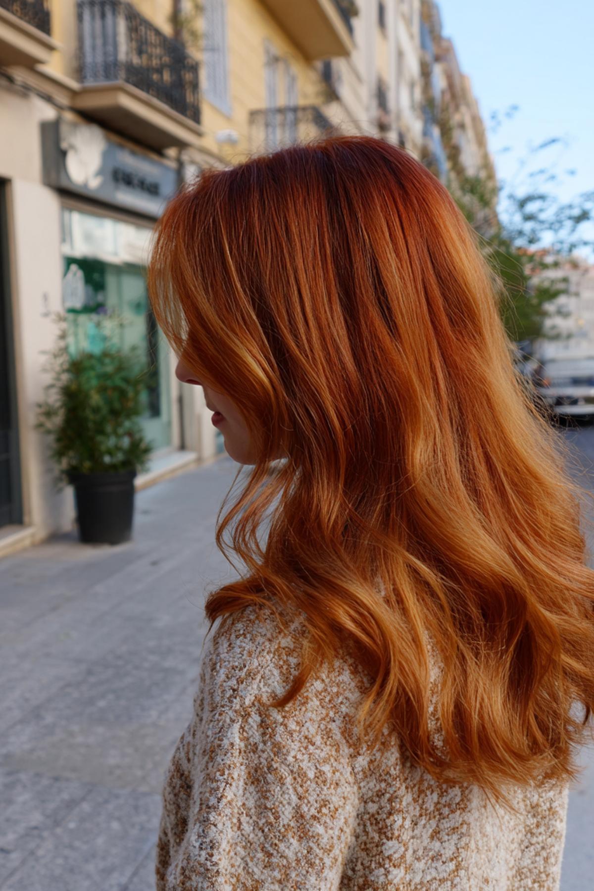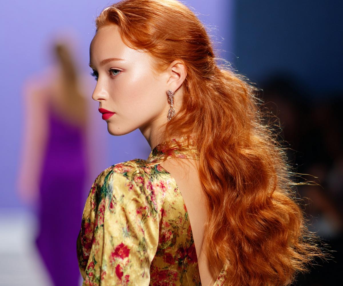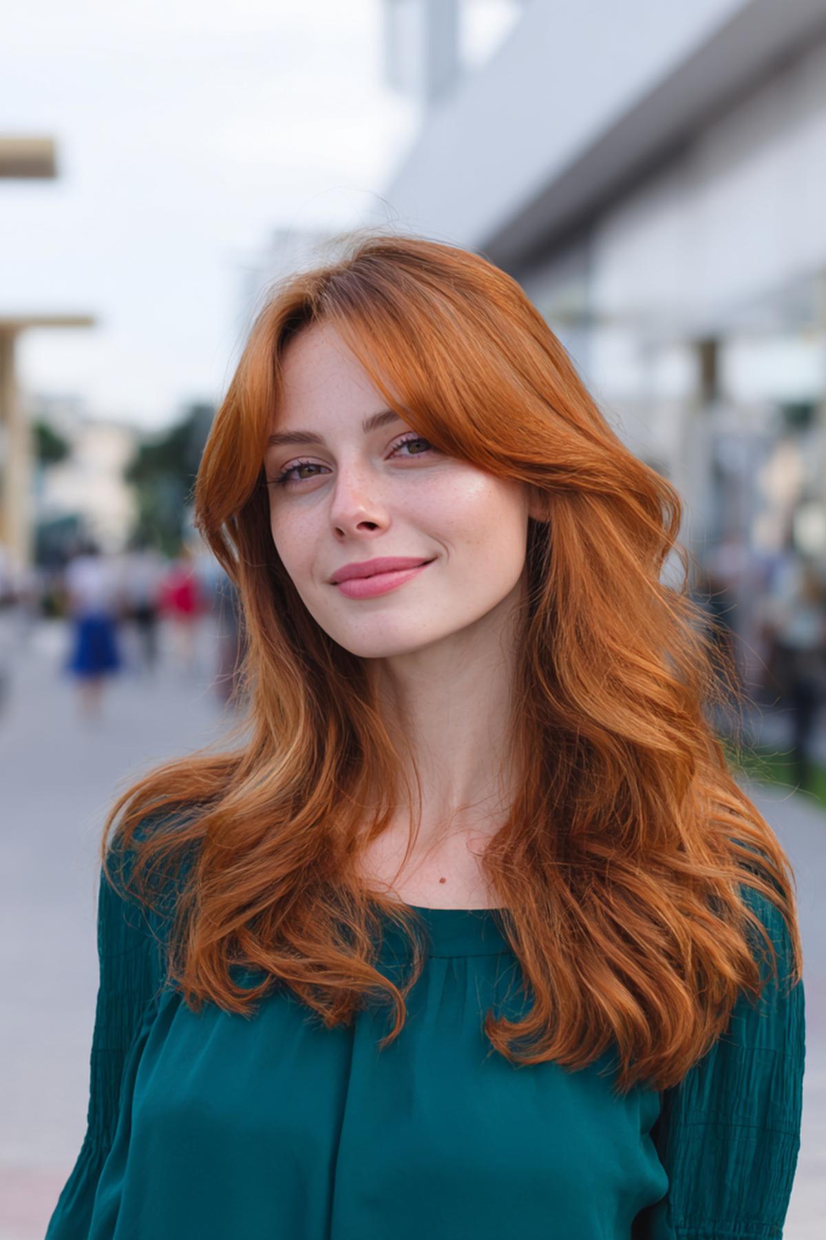 Uzun, gevşek dalgalı bakır saç; doğal kıvrımlarıyla şehir temposuna uyumlu. Omuz altına inen uzunluk, yüzü çerçeveleyip elmacık kemiklerini yumuşatır. Açık–orta tenlerde ve sıcak alt tonlarda canlı durur. Deniz tuzu spreyiyle sıkmadan şekillendir; uçlara besleyici yağ sür, renk daha derin görünür.