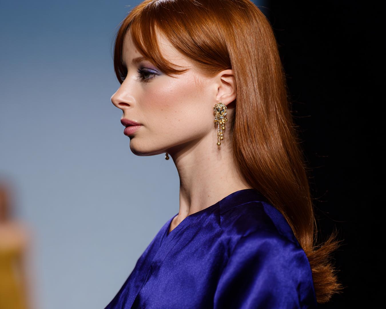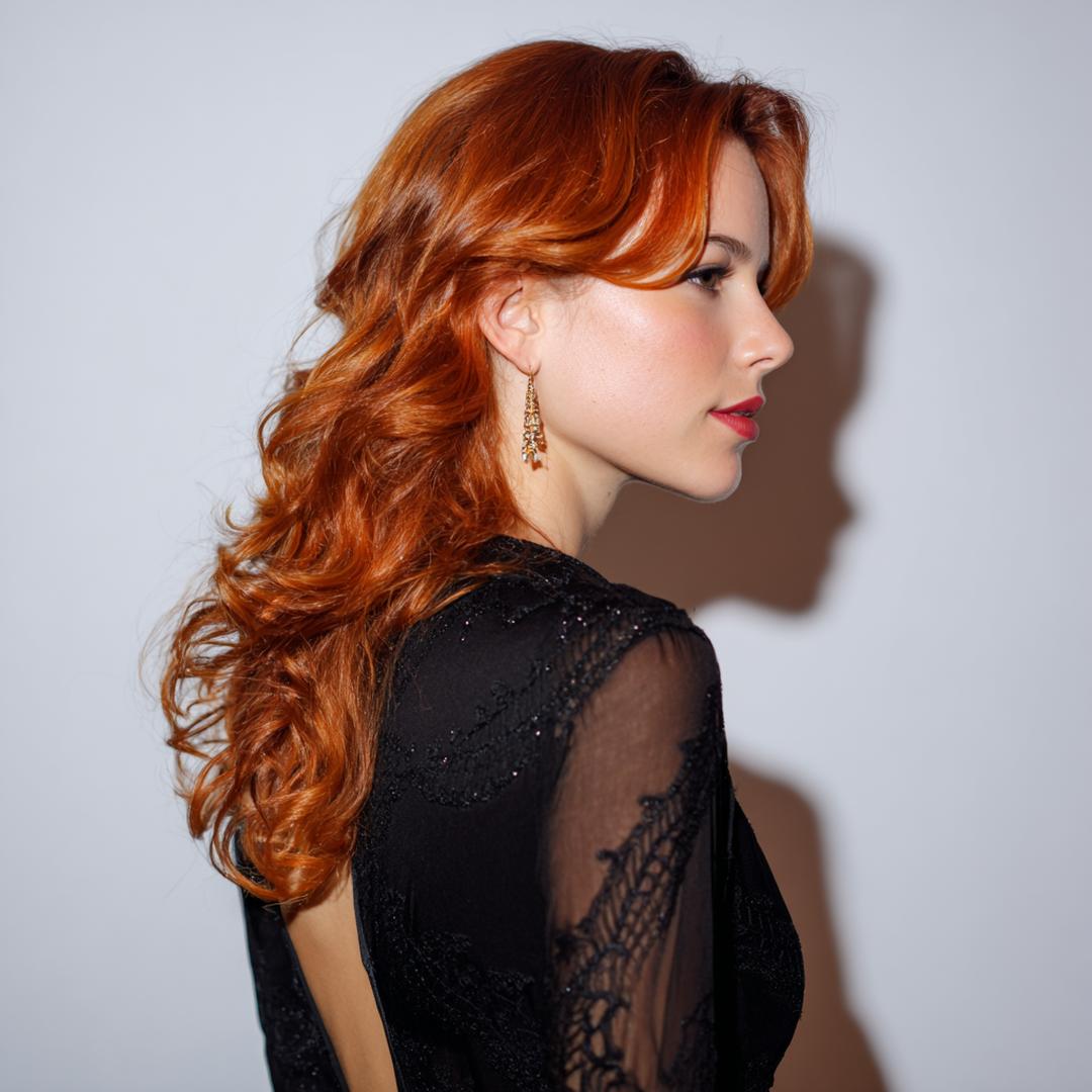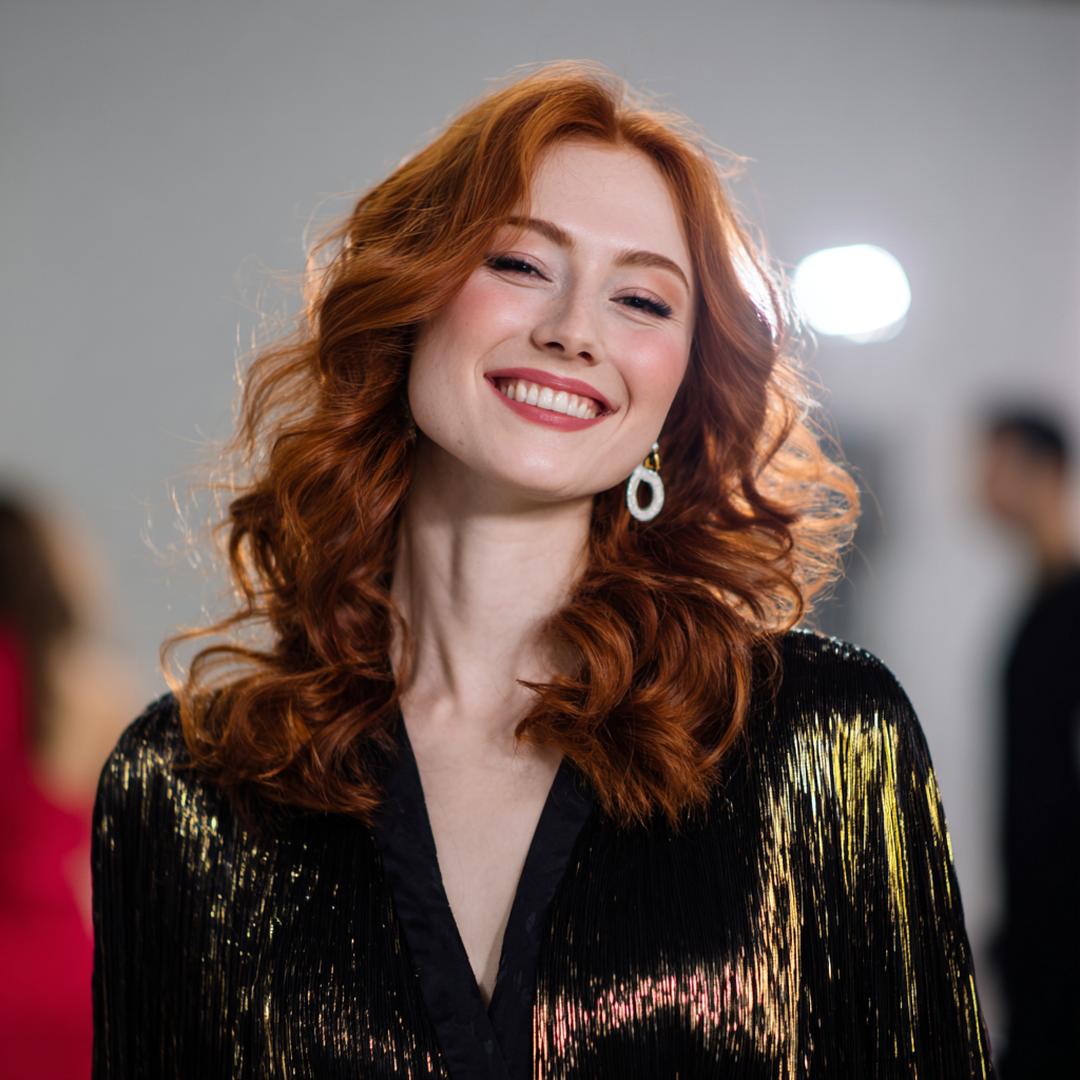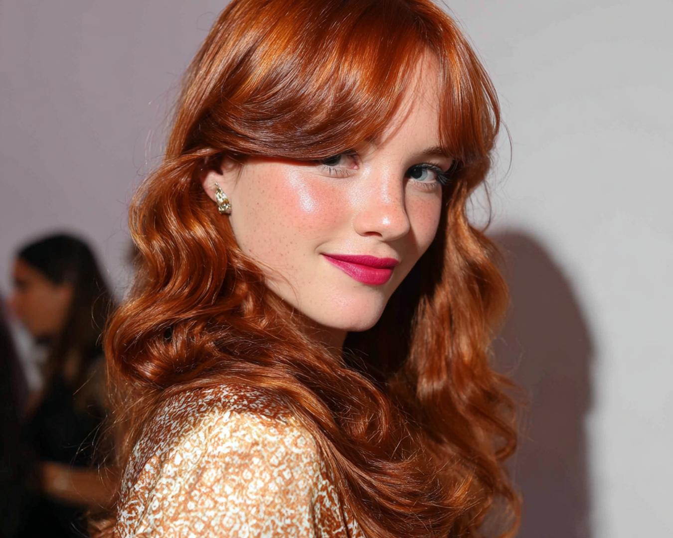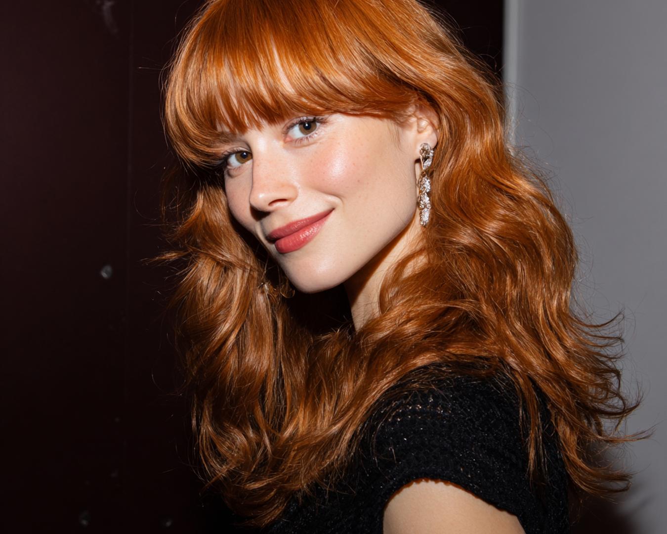 Uzun bakır dalgalar, perde kakülle yumuşak bir çerçeve oluşturur. Alın yüksekliğini dengeler, burun hattını nazikçe yumuşatır. İnce telli saçlarda hacim için kök spreyi kullan; kalın tellide ise parlaklık yerine esnek tutuş tercih et. Akşam stilinden günlük görünüme kolayca uyarlanır.