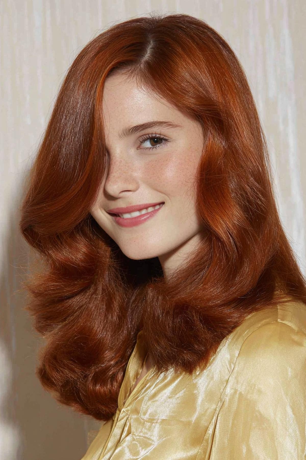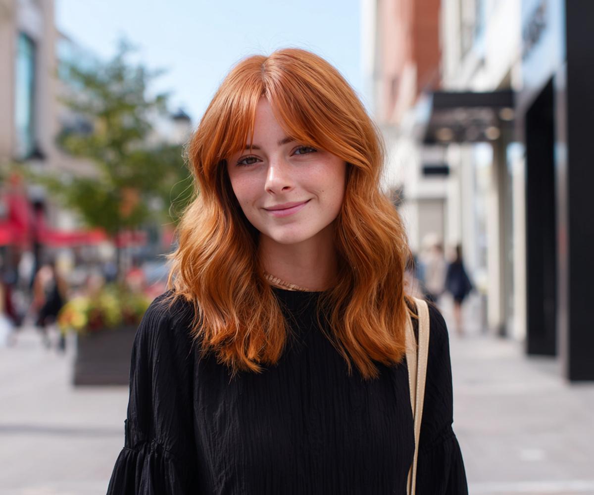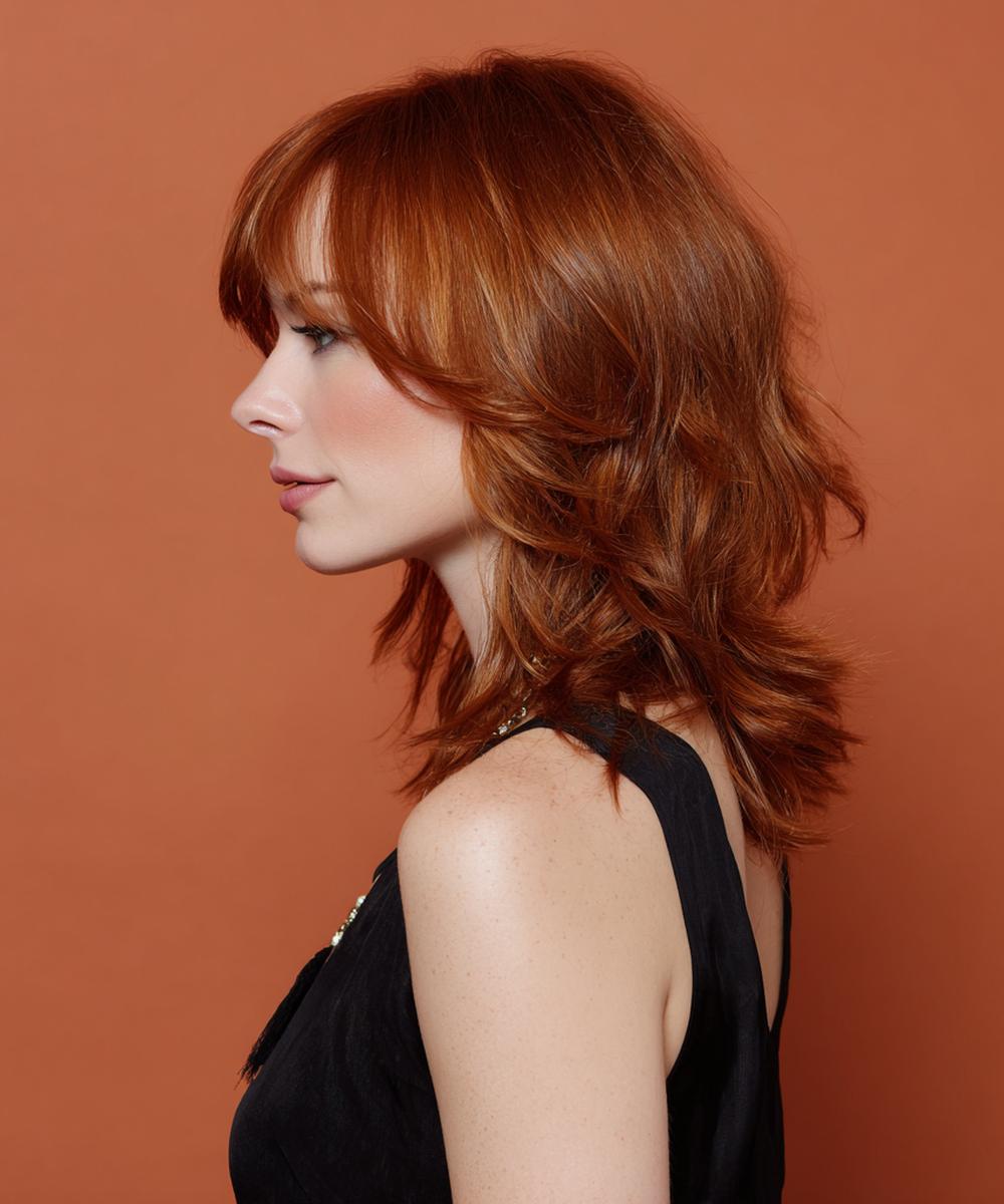 Perde kaküllü uzun bakır dalgalar yumuşak bir çerçeve yaratır. Geniş alınlı ve kalp yüzlerde denge sağlar. Nötr‑sıcak alt tonlarda taze bir ifade sunar. Köklerde hacim spreyi, uçlarda hafif krem kullan; kakülleri mini fırçayla içe kıvır.