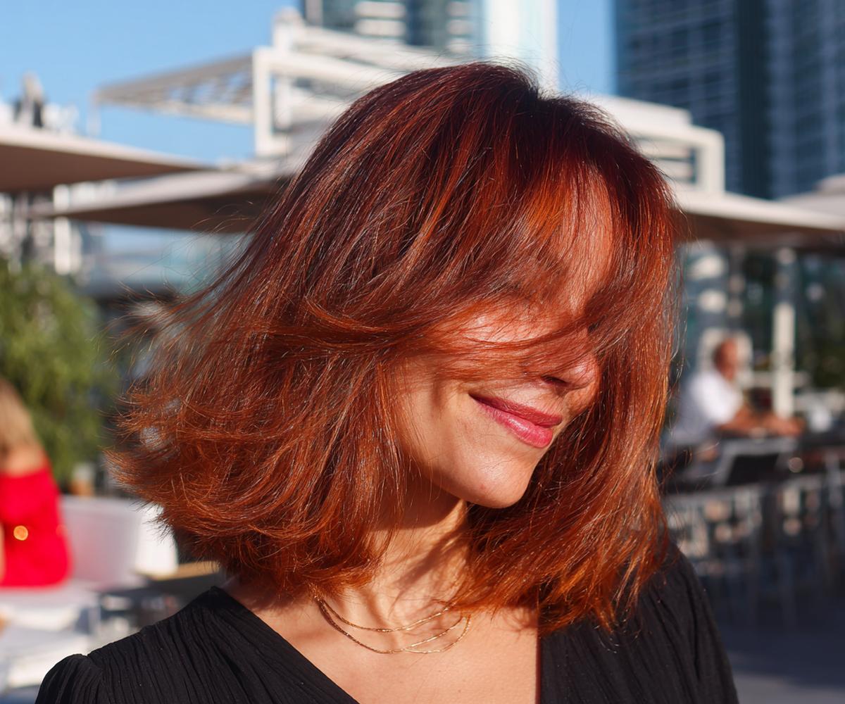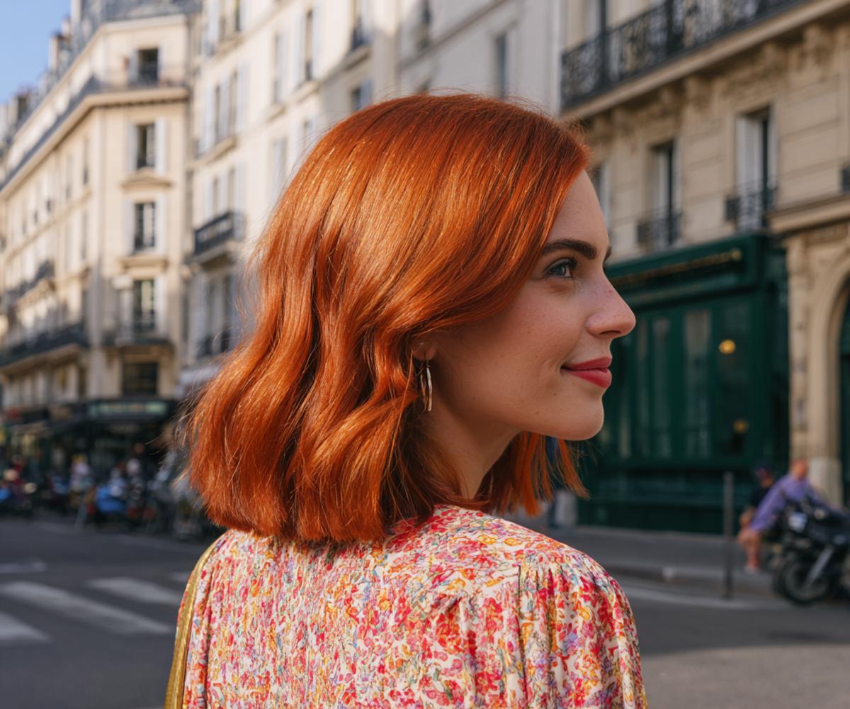 Uçları dışa dönen, fönle şekillendirilmiş katlı bakır lob. İnce telli saçlara anında hareket verir, boyun hattını zarif gösterir. Oval ve kalp yüzlerde çok dengeli durur; açık buğday ve porselen alt tonlarla uyumlu. Evde geniş fırça ve hafif tutuş spreyiyle 10 dakikada stil tamam.