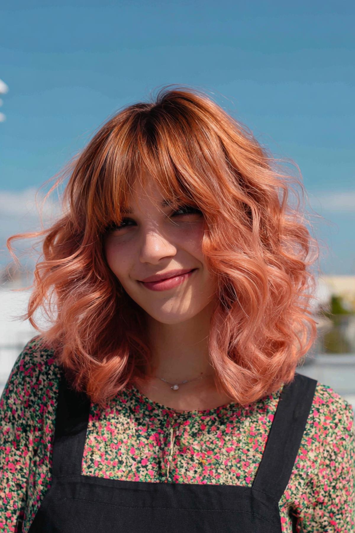 Şeftali‑gül bakır ton, perde kahkül ve yumuşak dalgayla romantik ama modern. Soğuk alt tonlu ciltlerde ısı dengesi kurar, çilleri tatlıca görünür kılar. Orta kalın tellide çok iyi durur. Perde kahkülü içe fönleyip uçları dışa kırın; doku spreyiyle bitirin.