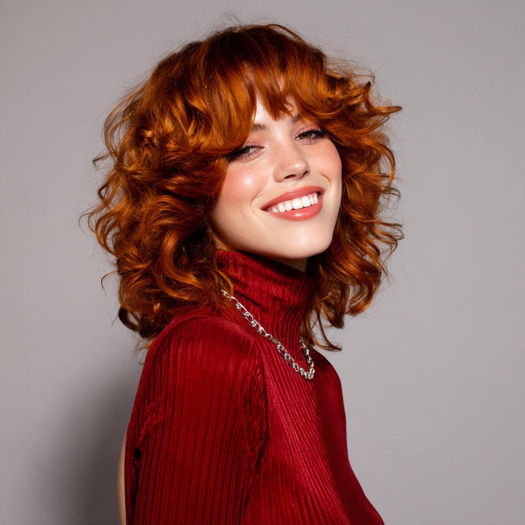 Kıvırcık shag ve yumuşak kakül, bakır tonla birleşince çok taze durur. Doğal dalgalı‑kıvırcık saçlarda formu gün boyu korur. Yuvarlak yüzlerde üst hacim güzel dengeler. Krem şeklinde bukle belirginleştirici kullanın, saçları difüzörle kurutun; kabarıklık kontrol altında kalır.
